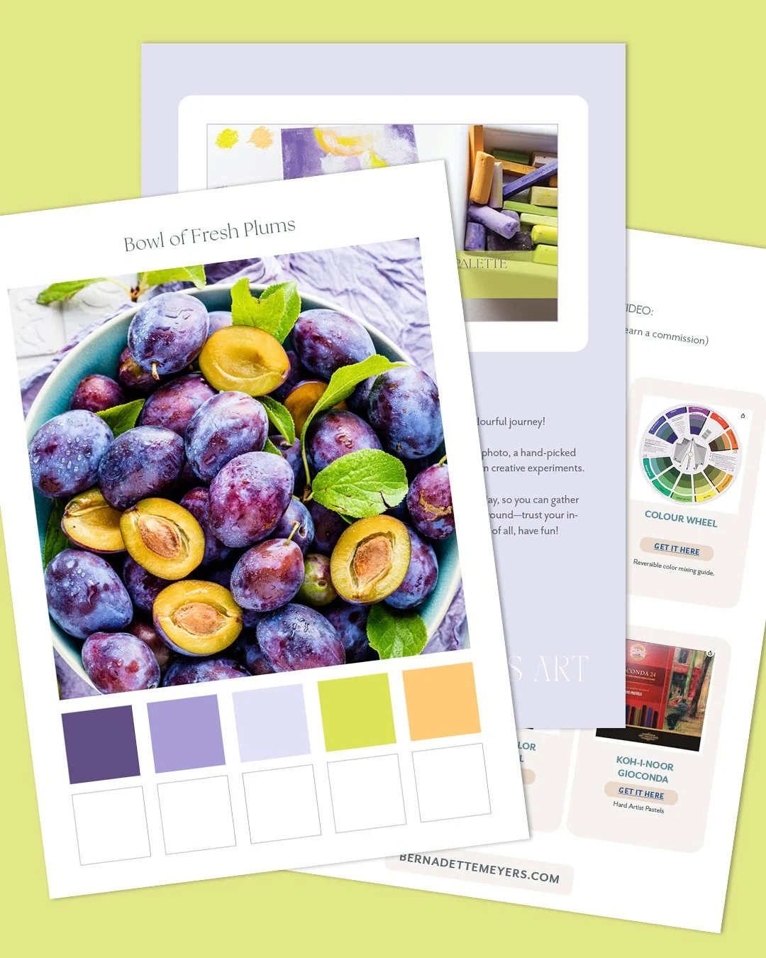 Inside this PDF that compliments my free youtube video tutorial you’ll find the beautiful plum‑in‑a‑bowl reference photo, a hand‑picked split‑complementary palette, and a blank template ready for your own creative experiments. You’ll also discover handy links to the pastels and supplies I used today, so you can gather everything you need to play along.